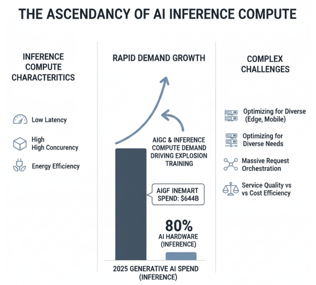 随着大模型应用的普及,推理算力的总需求已超过训练算力,成为算力消耗的主要部分。特别是在AIGC、智能助手等大规模应用场景,推理算力需求呈现爆发式增长。Gartner预测2025年生成式AI支出将达6440亿美元,其中约80%用于AI硬件,主要用于推理场景。如何高效满足海量推理请求,同时保证服务质量和成本效益,成为算力基础设施面临的重要课题。