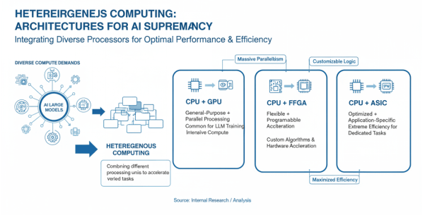 CPU+GPU是最常见的异构计算组合,CPU负责通用计算和任务调度,GPU负责大规模并行计算。这种组合充分利用了GPU在并行计算方面的优势,适合大模型训练等计算密集型任务。CPU+FPGA组合则利用FPGA的灵活可编程特性,适合需要定制化加速的场景,如特定算法的硬件加速。CPU+ASIC组合则针对特定应用进行深度优化,如TPU(Tensor Processing Unit)专门用于加速TensorFlow计算,能效比极高。