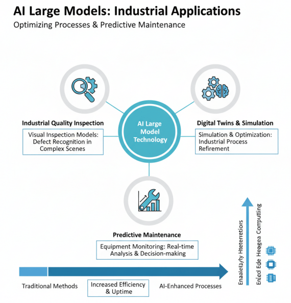 在工业领域,大模型在工业质检、数字孪生、设备预测性维护等方面发挥重要作用。视觉质检大模型能够识别复杂工业场景中的缺陷,数字孪生技术通过大模型仿真优化工业流程,边缘异构算力的部署使得实时分析和决策成为可能。