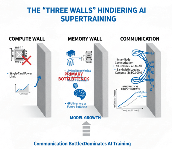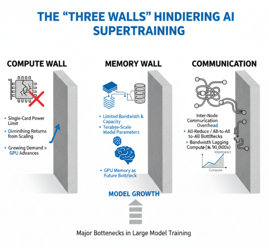 在大模型训练过程中,”三堵墙”——算力墙、存储墙和通信墙成为制约性能的主要瓶颈。