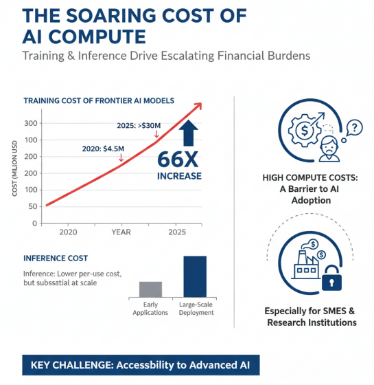 大模型训练和推理的高算力需求带来了巨大的成本压力。前沿模型的训练成本从2020年的450万美元增长到2025年的3亿美元以上,增长了约66倍。推理成本虽然相对较低,但随着应用规模的扩大,总体成本仍然可观。高昂的算力成本成为大模型技术普及和应用落地的重要障碍,特别是对于中小企业和科研机构而言。