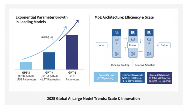 2025年,全球AI大模型技术呈现出快速迭代、规模持续扩大、效率显著提升的发展趋势。以OpenAI的GPT系列为代表,从GPT-3的1750亿参数发展到GPT-4的预估1.7万亿参数规模,再到GPT-5可能达到3至50万亿参数,模型参数量呈指数级增长。Meta的Llama系列作为开源大模型的标杆,2025年4月发布的4.0版本首次采用MoE(Mixture of Experts)架构,提供了三个不同规模的版本:Llama 4 Scout(1090亿参数)、Llama 4 Maverick(4000亿总参数,170亿激活参数)和Llama 4 Behemoth(2万亿总参数,2880亿激活参数,16个专家),展现了大模型架构的创新方向。