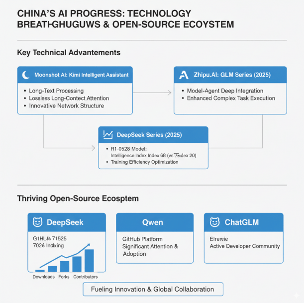 2025年,DeepSeek系列模型在国内外引起广泛关注,其R1-0528模型智能指数已达到68,相较于最初的67B模型有了显著提升,展现了中国在大模型训练效率优化方面的实力。国内大模型在开源生态方面也取得了显著进展,Deepseek、Qwen、ChatGLM等开源模型在GitHub等平台获得了大量关注和应用,形成了活跃的开发者社区。